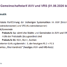 Die Reform reduziert die Zahl der bisherigen Preisstufen in VRS und AVV von heute 16 auf zunächst vier und später drei. Durch diese Reduktion entfallen mehr als 70 Prozent einzelne Tarifpositionen und machen die Tarifsystematik deutlich einfacher und übersichtlicher. Noch einfacher wird es dann nochmal in zwei Jahren, zum 01. Juni 2028, wenn auch die Kurzstrecke wegfällt.