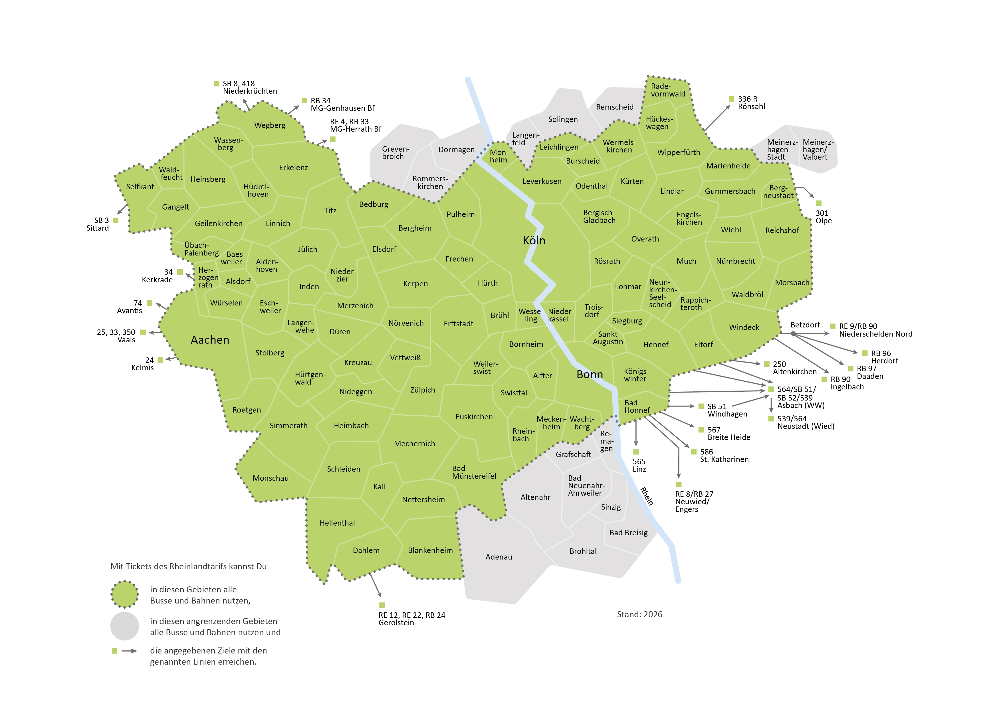 Mit den Tickets des neuen Rheinlandtarifs sind unsere Fahrgäste in den Gebieten des Aachener Verkehrsverbunds und des Verkehrsverbunds Rhein-Sieg ab dem 01. Juni 2026 so einfach wie noch nie unterwegs.