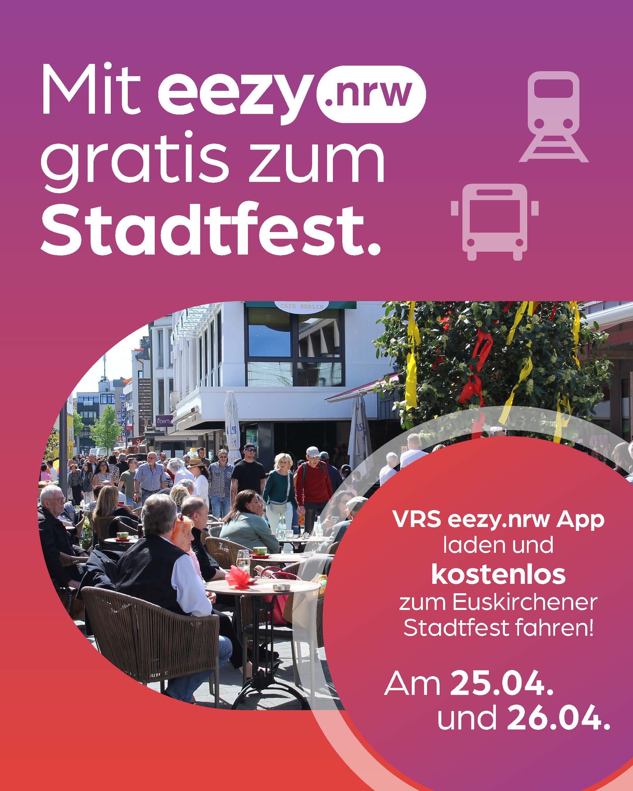 Am 25. und 26. April 2026 können Nutzende der VRS eezy.nrw-App kostenlos zum Stadtfest – einfach einchecken, bis „Euskirchen Bahnhof“ fahren, auschecken, und die Anreisekosten werden erstattet. Gilt auch für alle Mitreisenden!