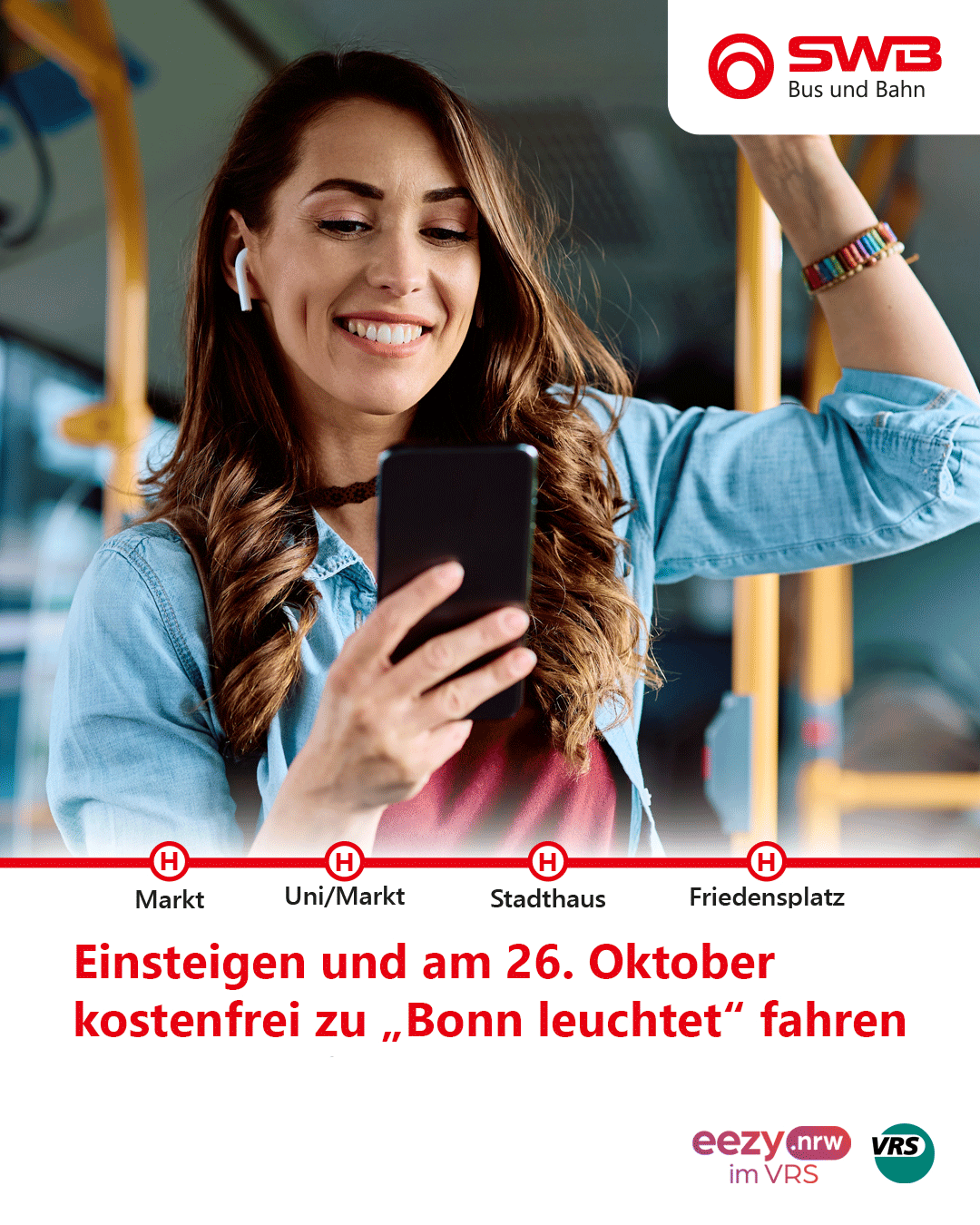 Die Aktion gilt ausschließlich am 26.10.2025 und nur bei Ein- oder Ausstieg an den genannten Haltestellen mit der VRS eezy.nrw-App.